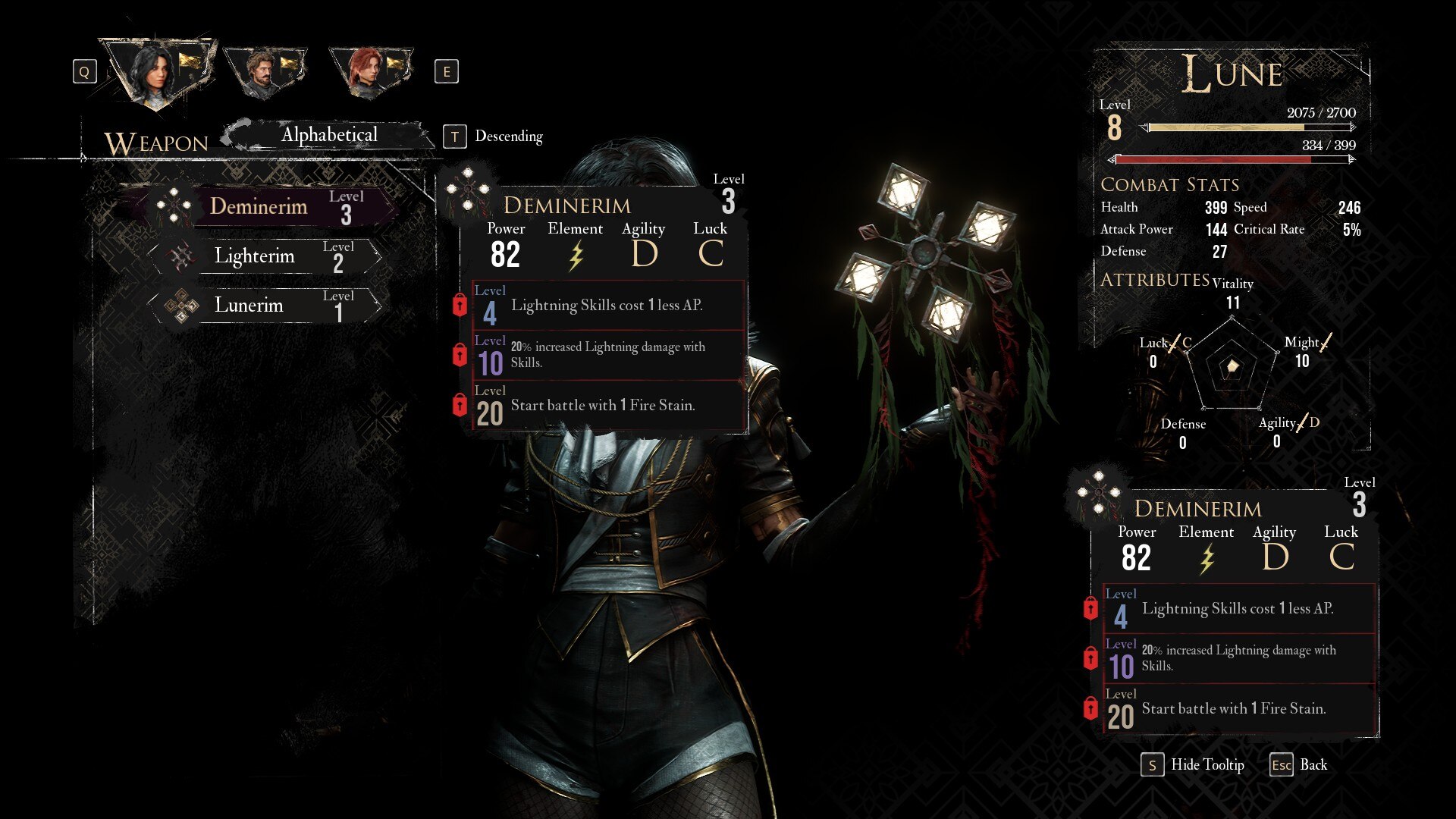 此外,Deminerim 可以同時擴展敏捷和運氣。通過將武器升級到 10 級或更高級別,您基本上可以使其成為一個非常有效的選擇運氣為主構建。