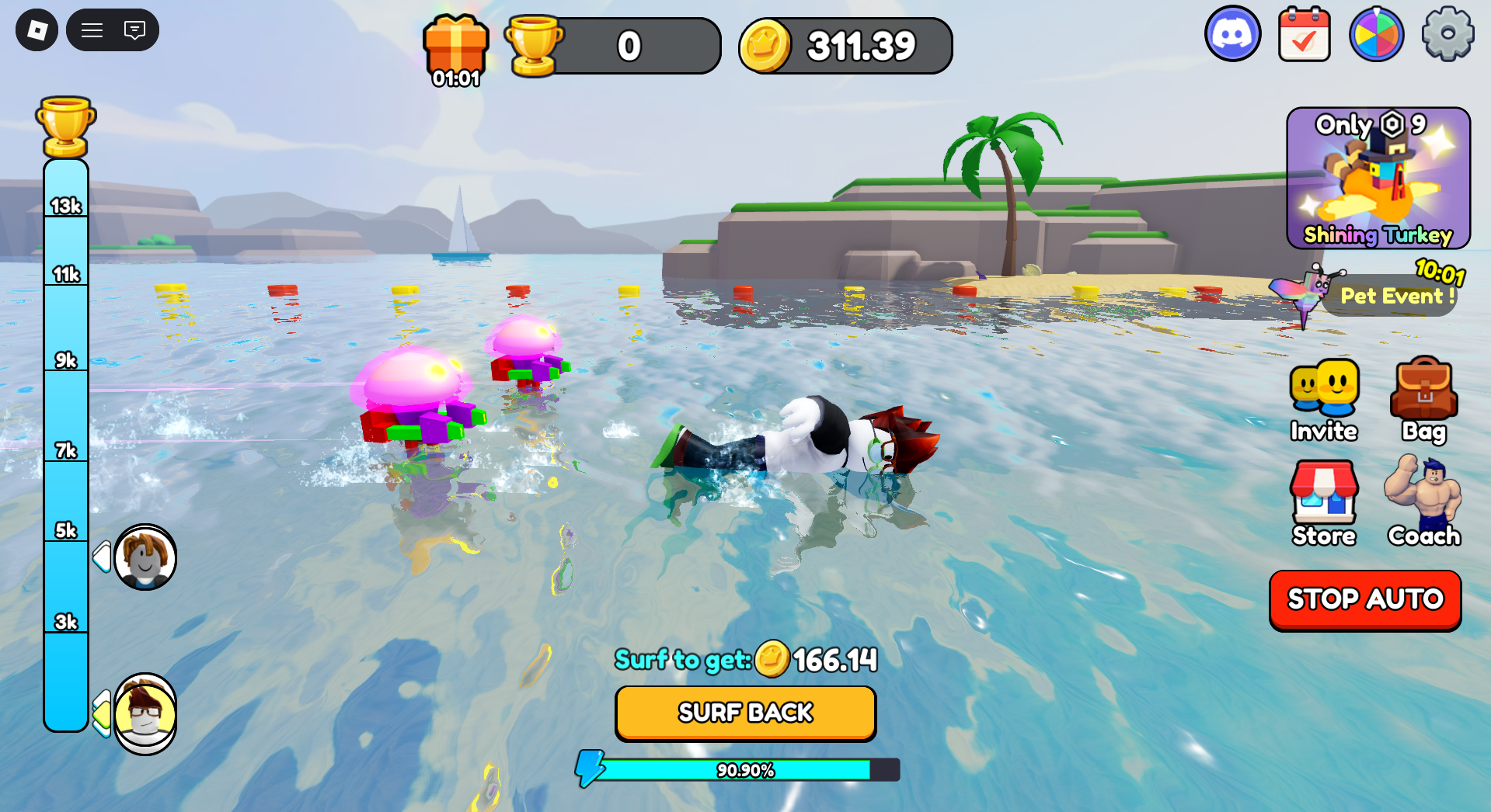 《游泳拯救公主》是一款有趣的 Roblox 遊戲,您將踏上冒險之旅,營救被困在遙遠海洋中的公主。一開始你會盡可能地游得更遠,但你會發現你的體力很快就耗盡了,所以你必須回去再試一次。為了變得更好,你可以通過游泳賺取金幣,並用它們來購買很酷的游泳裝備和可愛的寵物。這些可以幫助您游得更遠並每次賺取更多金幣。
