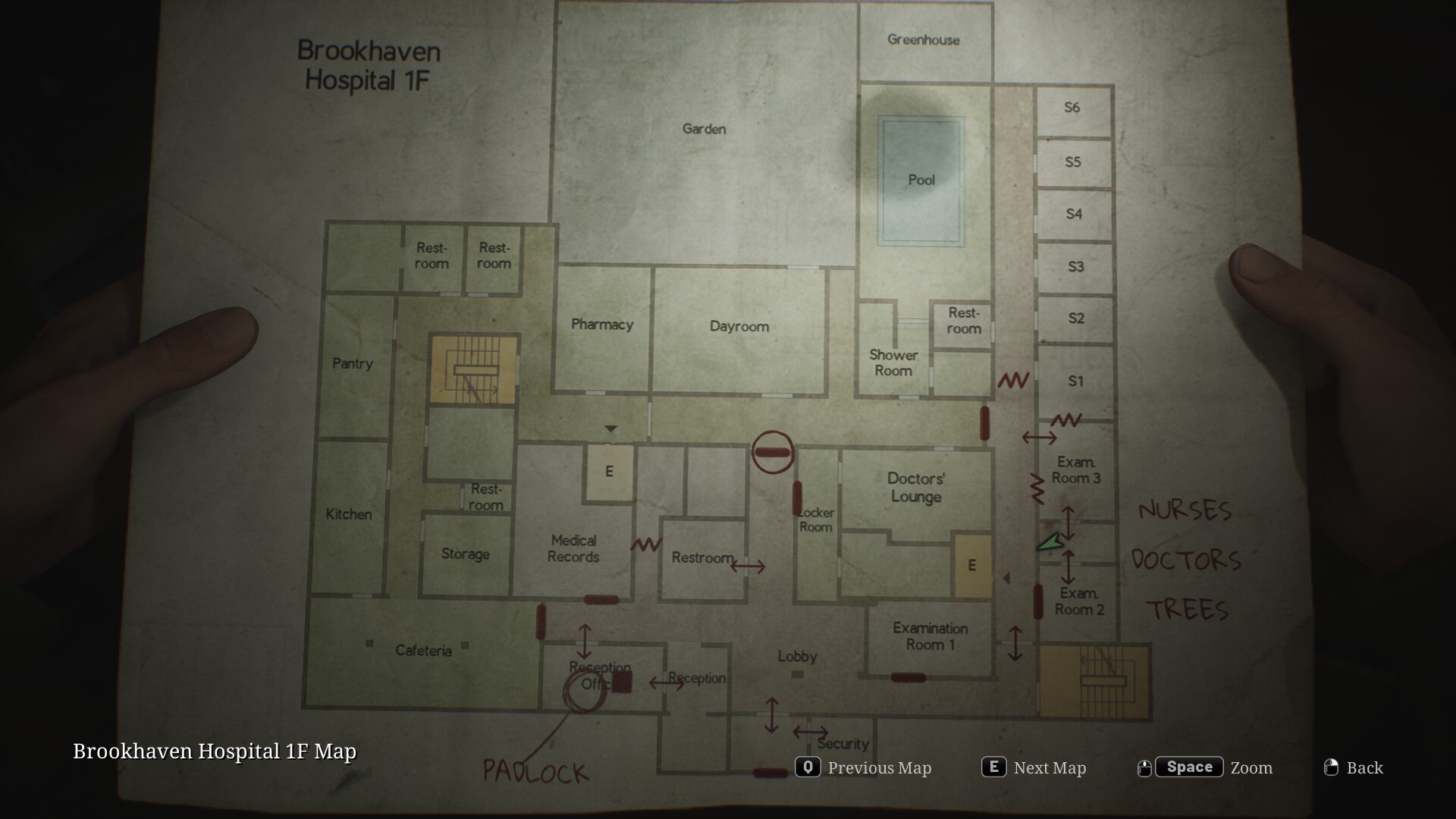 掛鎖的代碼對應於掛鎖的數量護士,醫生, 和樹木,在大廳對面的三張照片中。每個遊戲中這三個元素的排列都會有所不同。例如,在我們第一次玩遊戲時,組合是——護士>樹木>醫生。雖然這三個實體的組合對您來說可能不同,但帶有代碼的紙張位置將是相同的。獲得組合後,只需探索大廳即可找到三張圖片。這些照片可以在接待區附近找到,很難錯過。