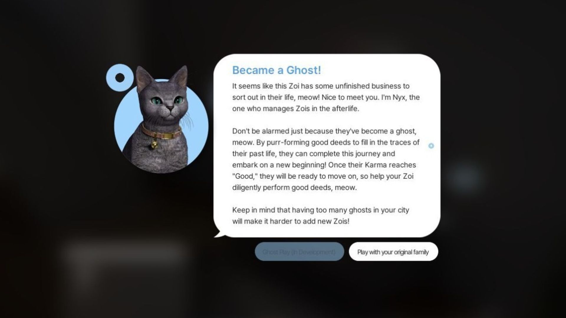 此外,犯罪的一生、做錯的事、與其他Zois的不良行為以及在監獄裡度過一段時間都會讓你的業力變壞,如果發生這種情況,只有這樣你才能在來世的結果中得到鬼魂。如果你過著美好而誠實的生活,那麼你就不必擔心這一點,你可以重新加載舊的保存或在死後開始新的保存。