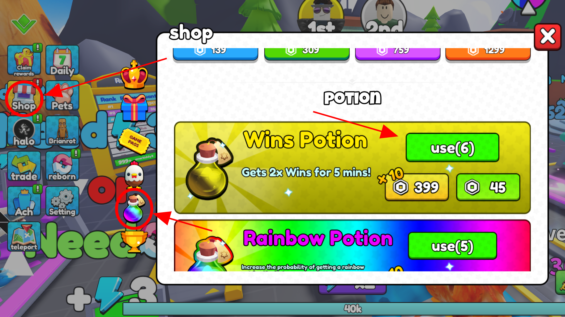 - 結合使用可增加金色和彩虹寵物機會的藥水,以最大限度地提高獲得好寵物的機會。
