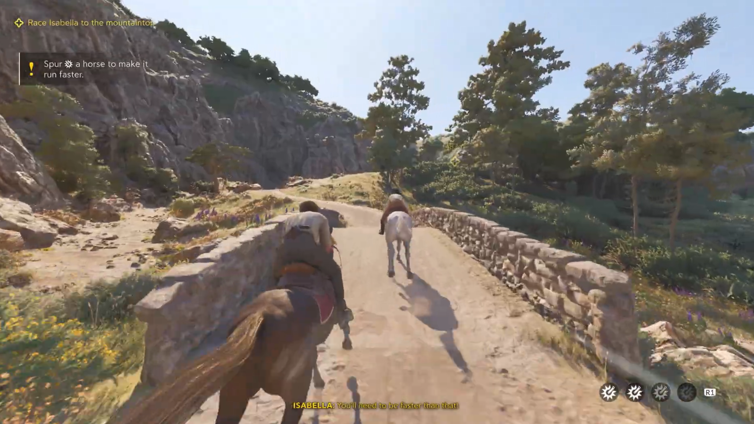 要啟動發動機,請先按“X”,使指示條上升。現在等待欄落下並在白色框內再次按“X”。重複此動作兩次,汽車即可開始工作。重新騎上馬,與伊莎貝拉一起繼續旅程。她將引導您從另一條風景優美的道路走下去。途中,伊莎貝拉還將在教堂外與西科內神父進行簡短交談,之後我們的旅程將繼續。