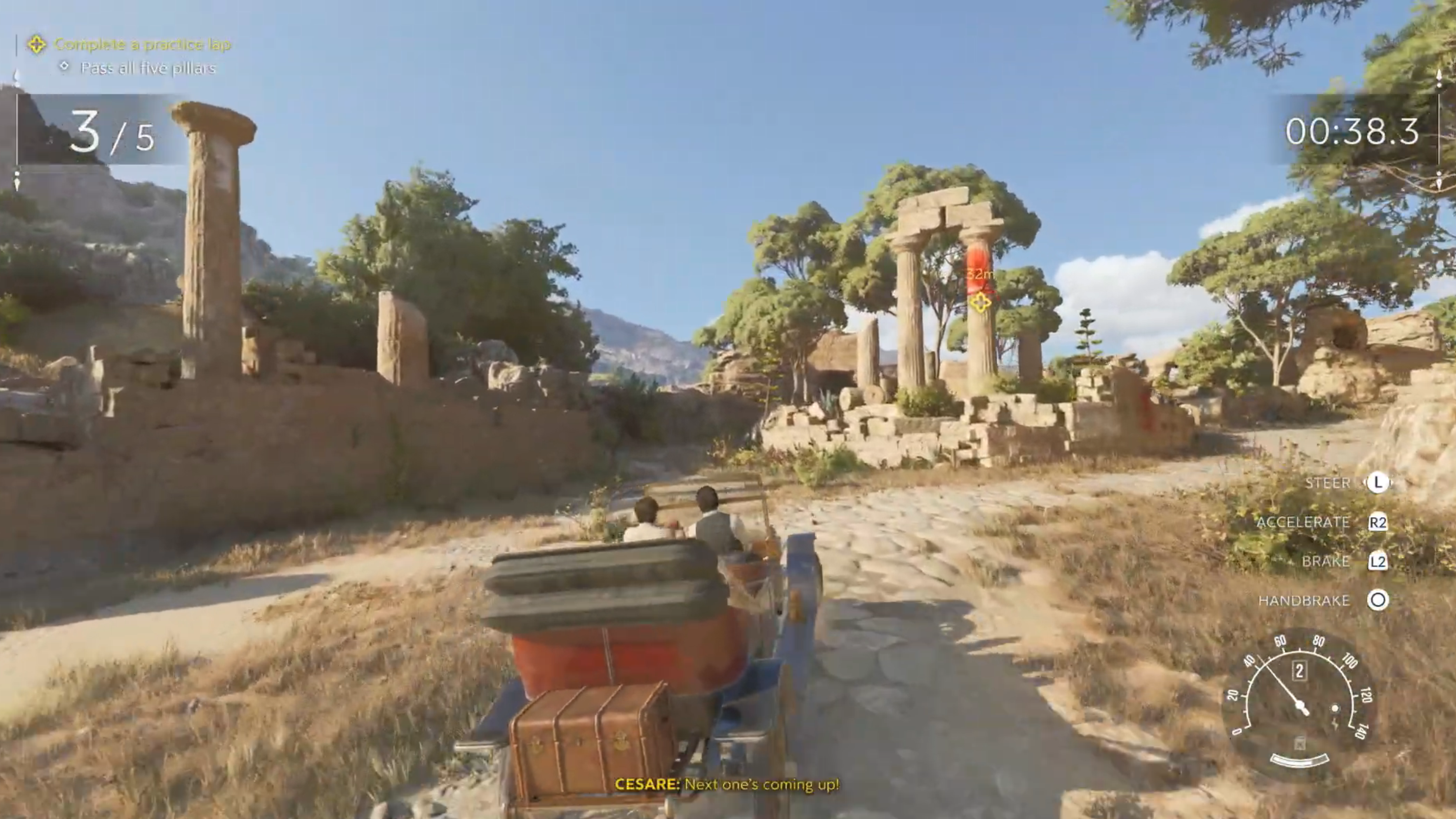 這條賽道要求您駕駛汽車越過所有五個支柱。有一個計時器可以計算完成整個電路所需的準確時間。如果您在賽道上花費的時間超過 45 秒,Cesare 會要求您再次嘗試。一旦你超過了目標時間,他就會要求你前往寺廟。在墨西拿和他的獵人徒步戰鬥序列開始後,這將觸發過場動畫。