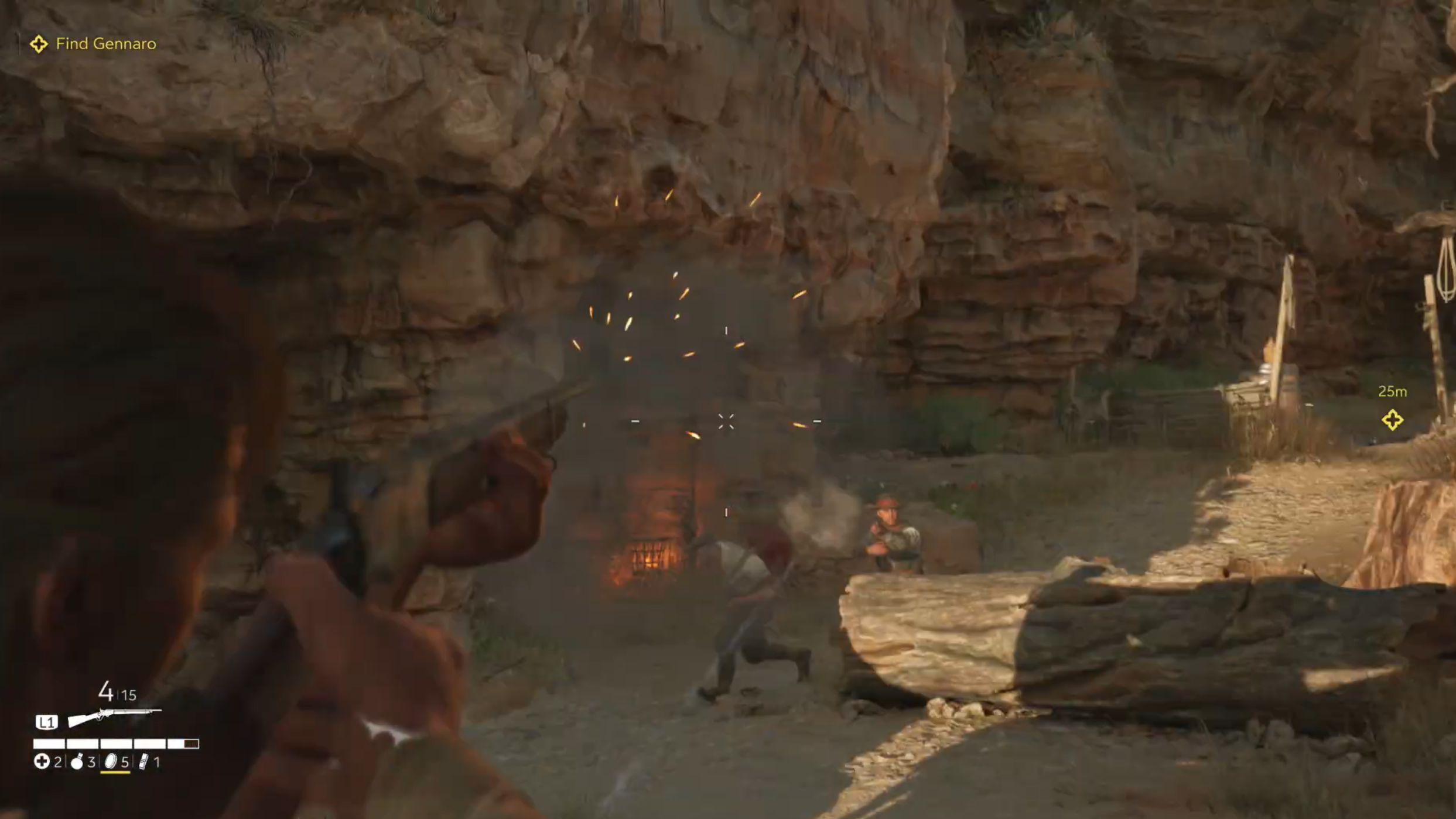 在途中,由於敵人破壞了柱子,您將需要使用與他們平行的輔助道路。追逐進行了大約 3 分鐘,恩佐抓住一匹馬並跳上了它。然後您將繼續騎馬追逐。你將通過殺死路上的所有獵人來慢慢前進。在這次跑步中,三名騎馬者將連續出現大約四次。向每個騎馬者射擊兩次就可以了。一旦你殺死了所有 12 名騎馬者,你就會追上梅西納和伊莎貝拉並觸發一個新的過場動畫。
