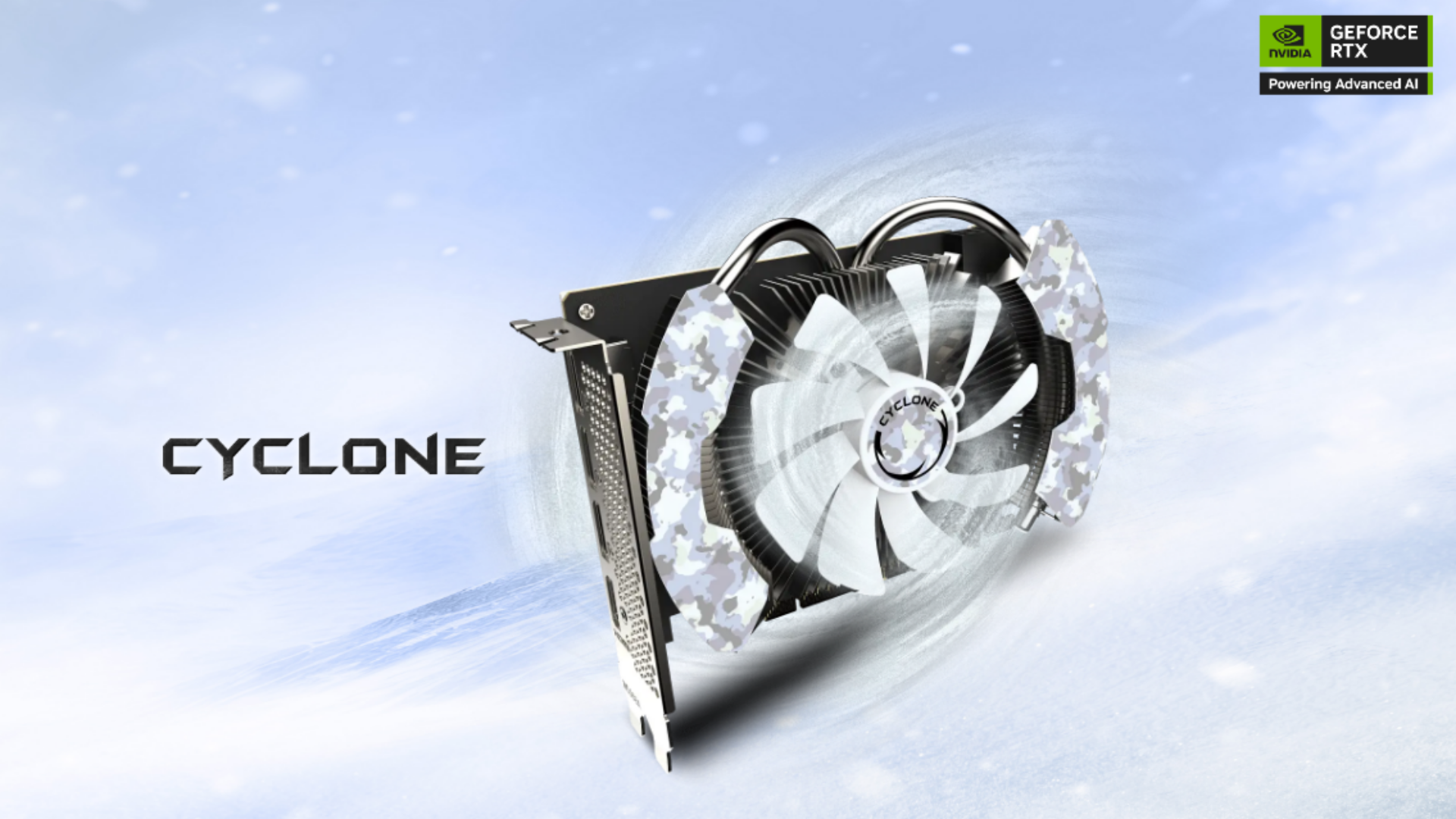 該 GPU 具有磨砂表面、白色風扇以及具有軍用雪迷彩美感的周圍區域。據微星介紹,這款Cyclone設計採用了“向日葵散熱器”,其整體散熱設計的靈感來自於“旋風風暴”。兩個熱管用於傳遞 GPU 的熱量。
