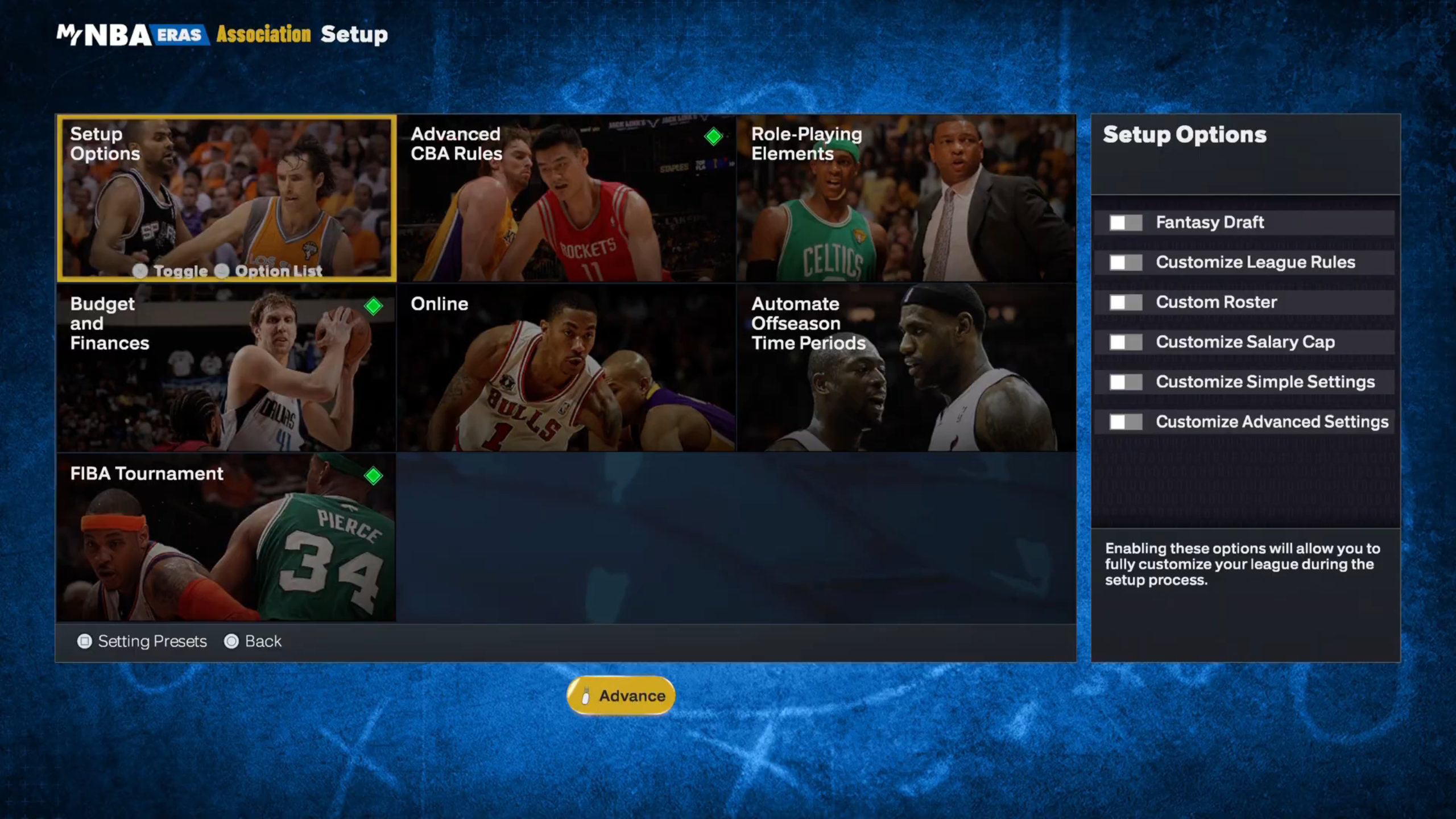 這是主要的設置選項,您可以在其中控製本賽季的一些主要功能。這些將包括幻想選秀、自定義聯賽規則、自定義名單、自定義工資帽、自定義基本設置和高級設置。