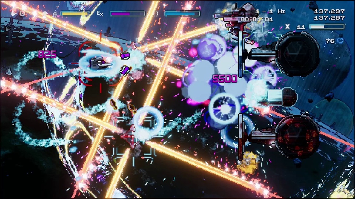 任務開始後,您將使用左側模擬搖桿或方向鍵來駕駛您的飛船。您可以使用 Y 按鈕向敵人開火,然後按 B 按鈕進行快速桶滾。這將使您能夠發射尋的導彈和能量束。如前所述,與其他射擊遊戲相比,該遊戲以一種有趣的方式處理事情。當你的飛船接觸敵人的射彈時,護盾就會激活。當你的護盾激活時,你可以吸收射彈來增強能量。護盾不會永遠持續,所以你需要在護盾充電時避免射彈。你有一個 EX 能力,可以用 X 按鈕激活。一旦你通過用盾牌吸收射彈積累了足夠的能量,就可以使用它。