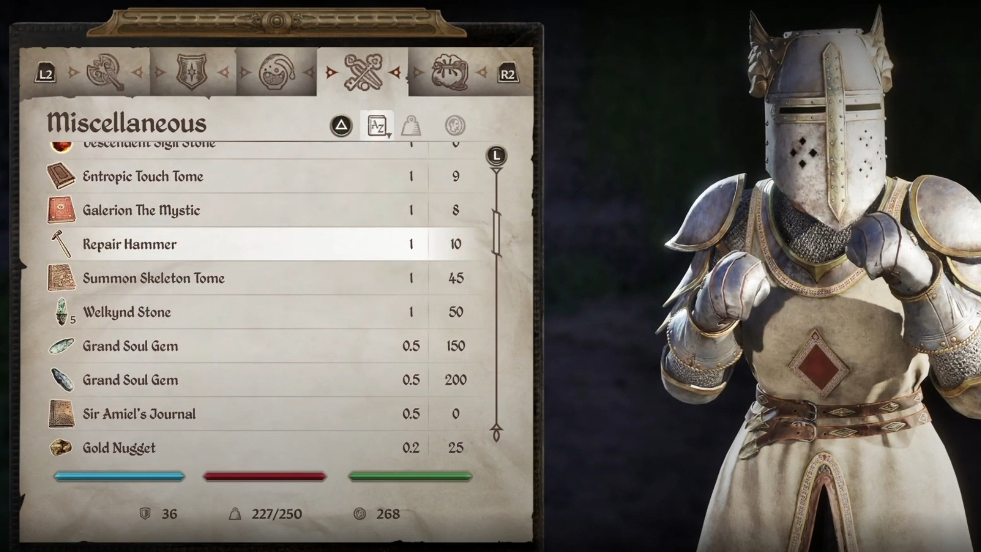 當您擁有修理錘時,打開庫存屏幕。轉到倒數第二個選項卡,其中列出了您的所有雜項項目。從那裡找到修理錘並左鍵單擊它。這將打開修復屏幕。然後,選擇您想要修復的武器或盔甲。這樣做會消耗一把錘子並恢復所選物品的部分耐久度。
