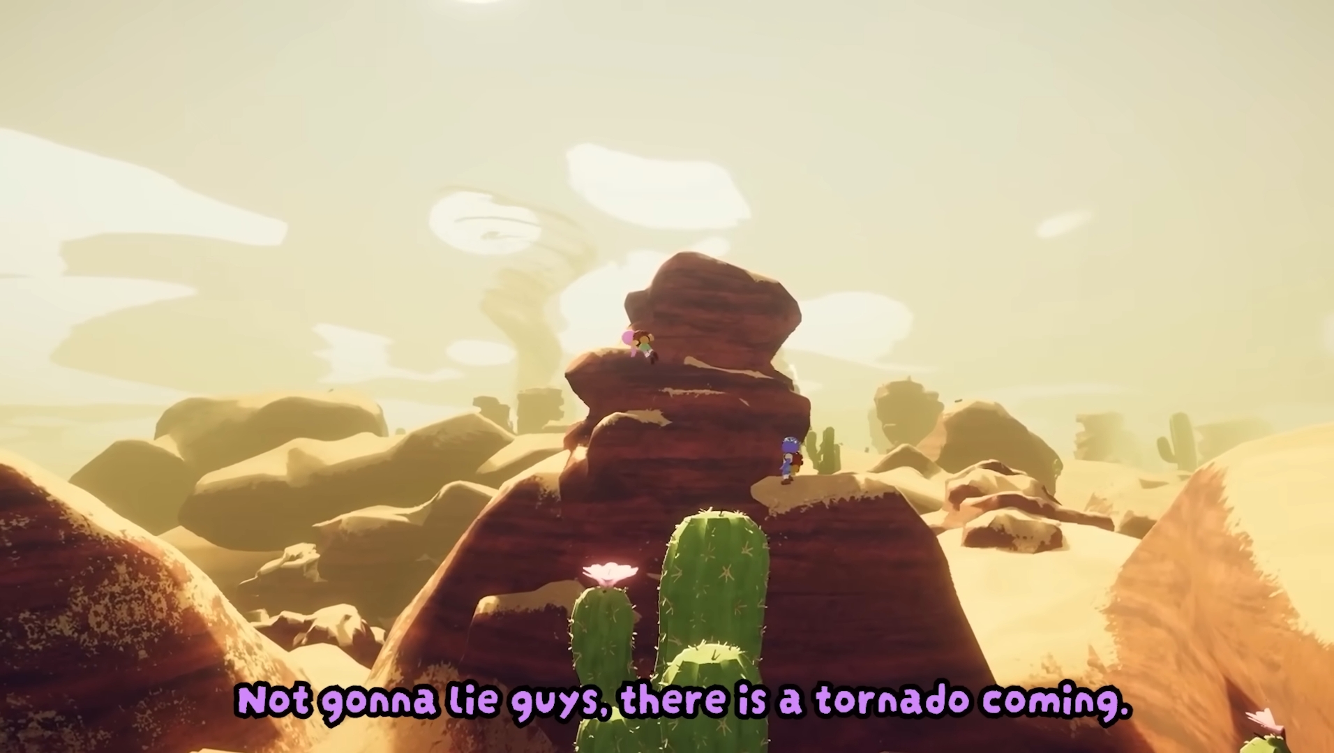 龍捲風穿過地形,所以躲在一塊岩石或懸崖後面是徒勞的。只要你在地面上並且靠近龍捲風路徑,你的角色就會被強風吹來甩去。最糟糕的地方就是露天,因為你的角色可能會偏離路徑、受到墜落傷害或被仙人掌刺穿。