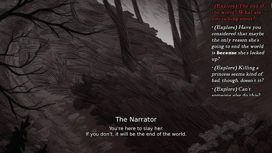 這種恐怖悲喜劇體驗的控制將讓您通過使用左側模擬搖桿或方向鍵做出多種選擇,並使用 X 按鈕確認您的選擇。選擇會產生後果,而你的選擇將決定特定跑步的結局。如果你不想殺死公主怎麼辦?這當然是一個選擇。只能選擇轉身。嗯,除了當你走離開小屋的路時……你最終也會到達小屋!接下來是一場冒險,我不會在這裡劇透。