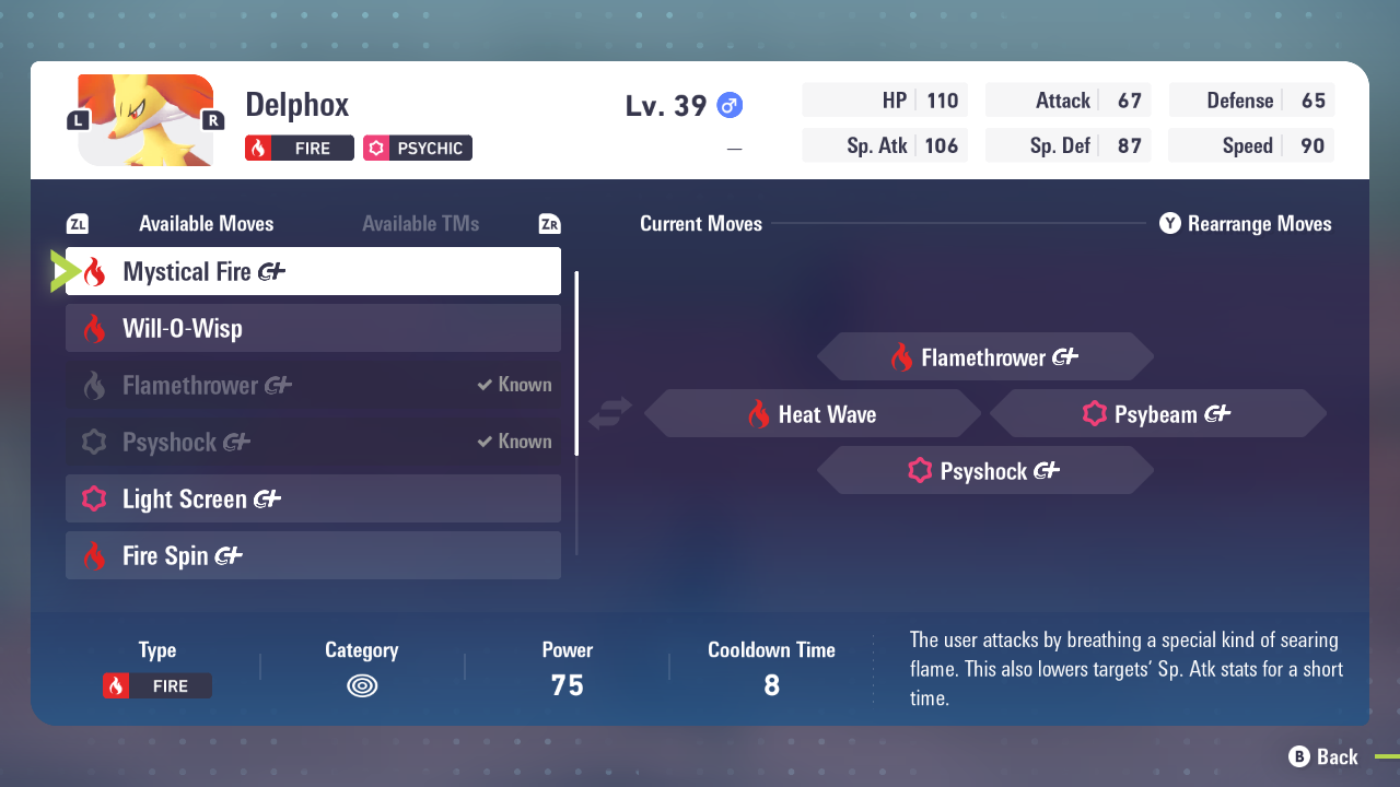 由於 Delphox 是火/心靈類型,因此這些是您應該在其移動集中嘗試使用的主要類型。這將使您在這些攻擊中獲得 STAB(同類型攻擊增強)。理想情況下,你的動作應該是這樣的: