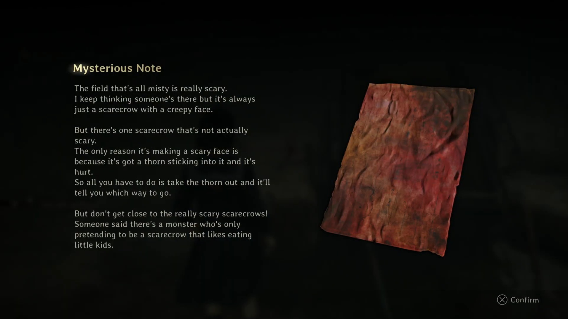 | “今天是你的葬禮。再見,再也不要露面了。就像你一樣,去做自己的事。” | 按照地面上的稻草人的指示自行從孤立的稻草人中取出荊棘。 |