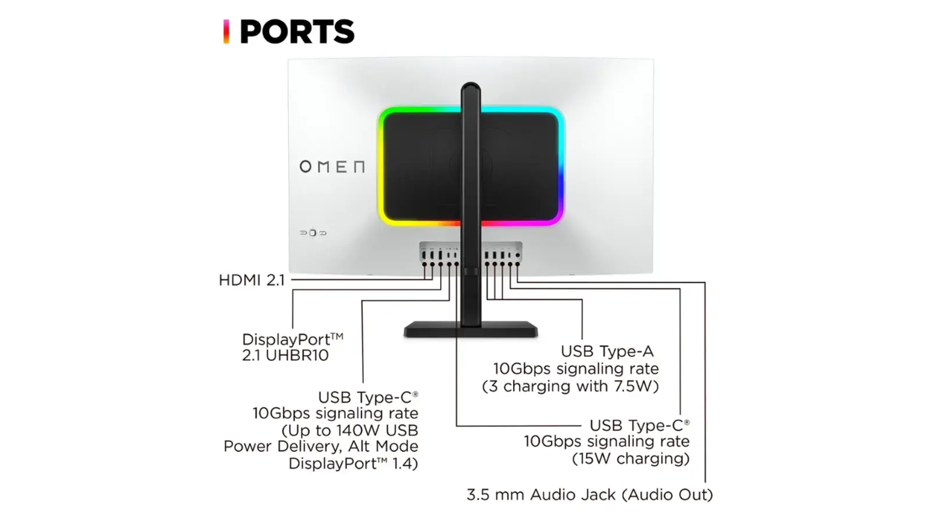 | 港口 | 1× DisplayPort 1.4、2× HDMI 2.1、1× USB-C(DP Alt 模式)、2× USB-A、1× 3.5 毫米音頻輸出 |