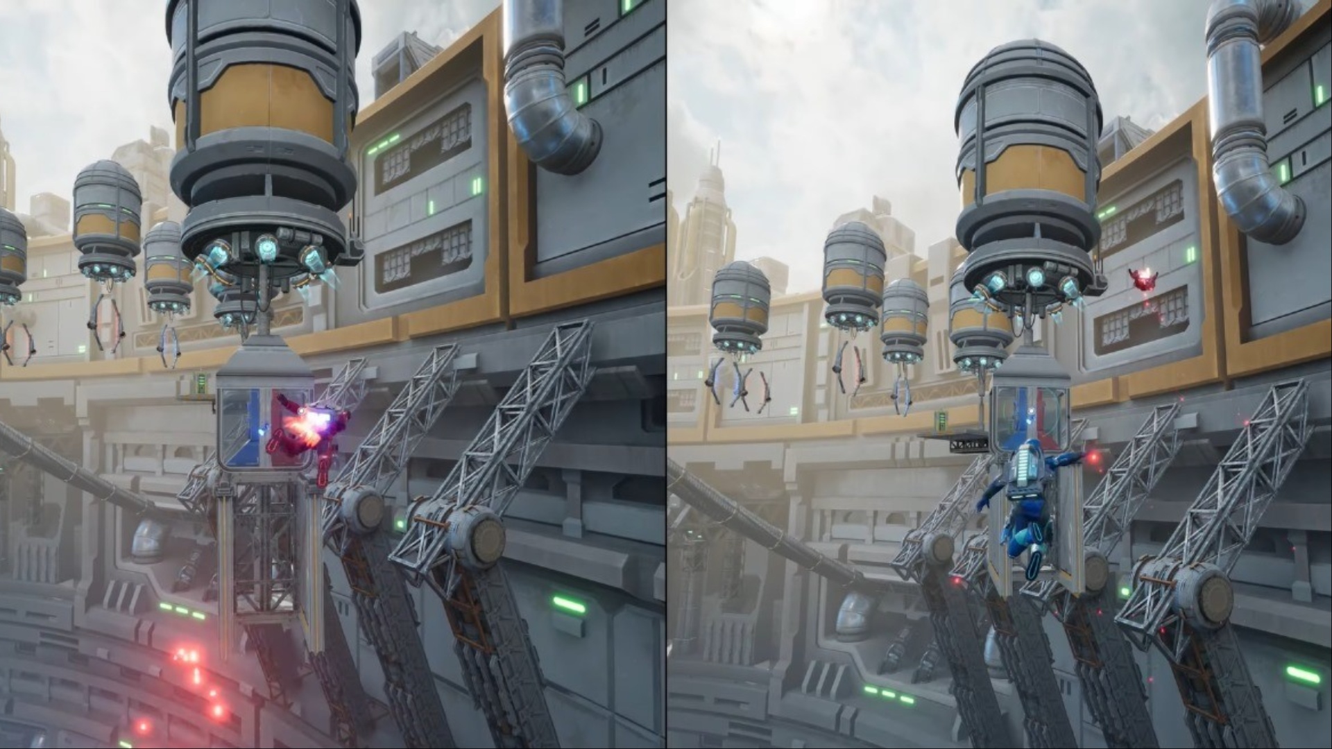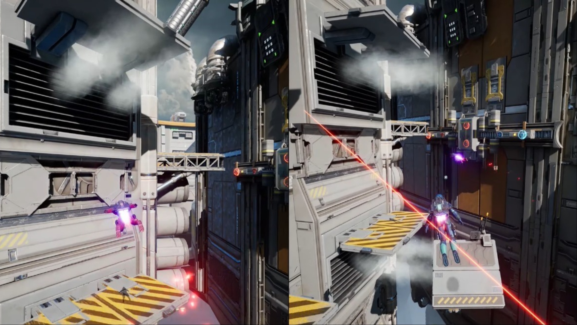 如果你完成了支線任務,繼續前進並懸停在右側,兩個玩家都必須使用他們的爆能槍擊中飛行裝置上的目標。射擊開關,它會為你創造一個站立的平台。