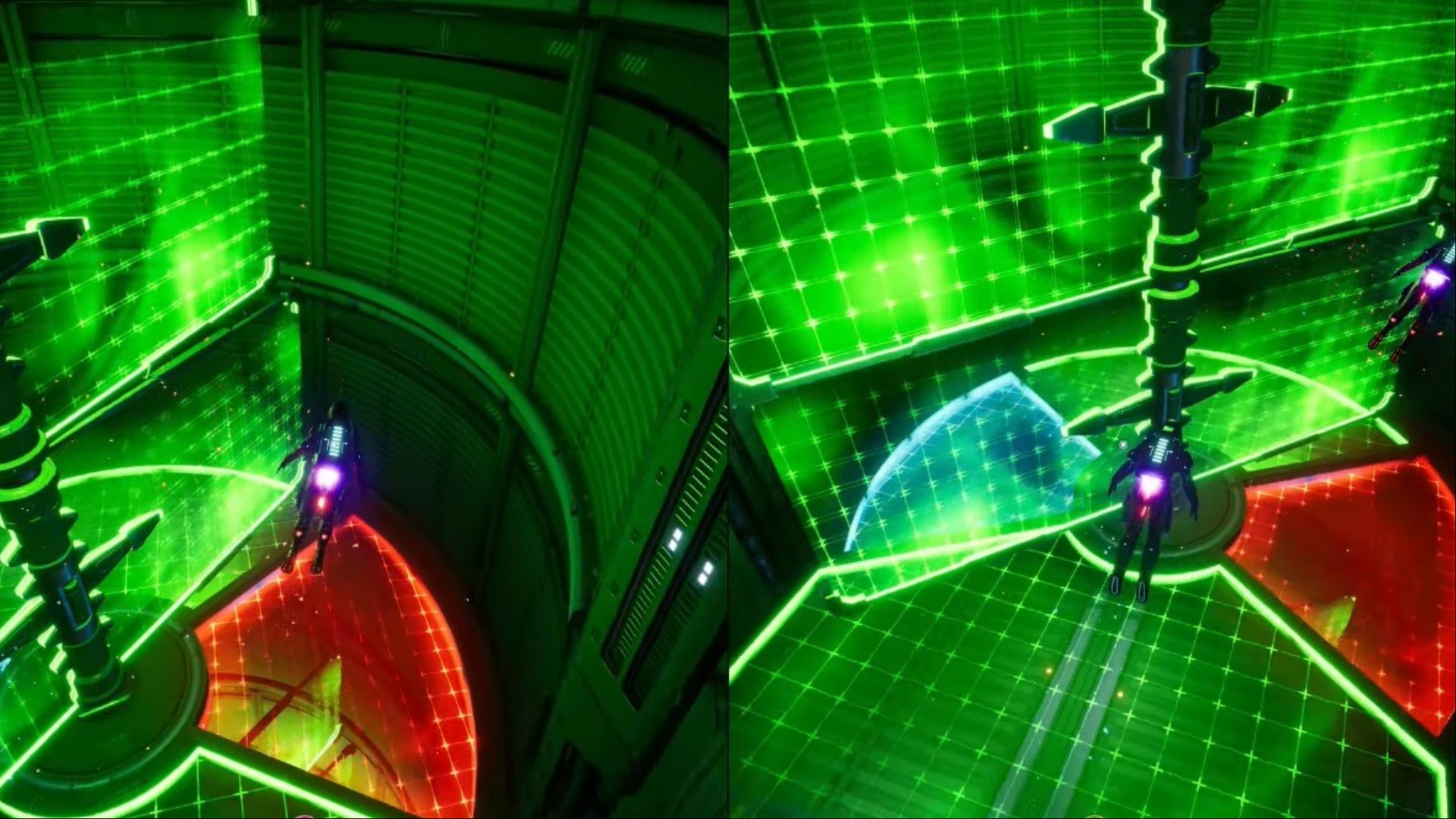 進入隧道後,繼續前進,避開綠色障礙物和激光。繼續移動,直到您看到一個巨大的旋轉柱子,上面附有許多綠色障礙物。下降並在正確的障礙物上使用護盾破壞者。在進入最後一個房間之前,你必須穿過兩個障礙。在這裡,您會發現兩個基座,您可以在其中放置噴氣背包並繼續執行下一個任務。