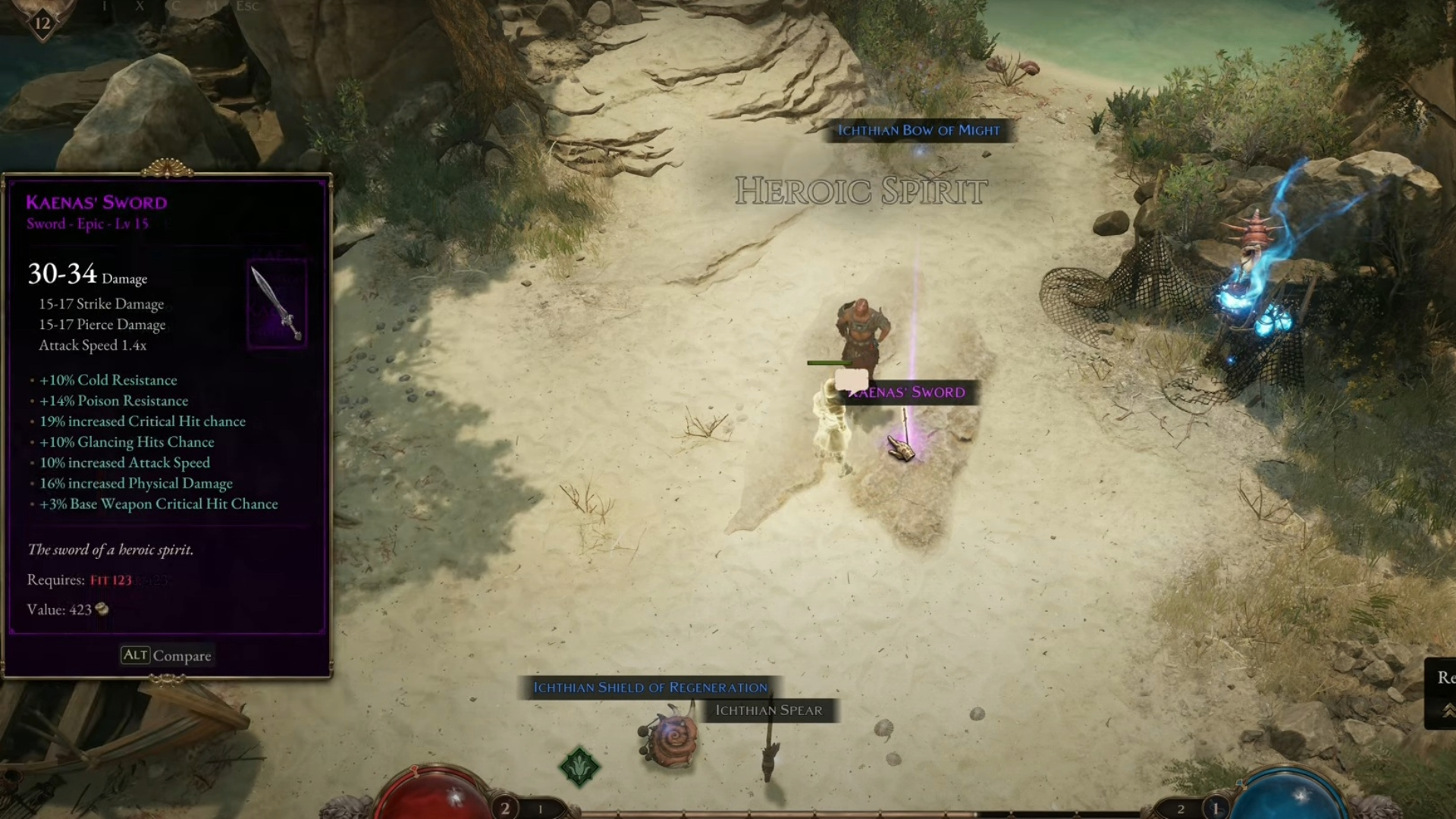 一旦你征服了所有四波浪潮,你就可以與凱納斯的鬼魂交談。他會要求你取回他的劍,這樣他的靈魂就可以得到安息。您必須從您當前所在的位置向北前往懸崖。在那裡,你會發現另一群你需要擊敗的伊克西亞敵人。戰鬥結束後從該位置奪取凱納斯的刀片。當他回到倒下的戰士的幽靈時,他說他已經準備好放棄這把劍並允許你保留它。這是一個傳奇劍具有相當高的統計數據。