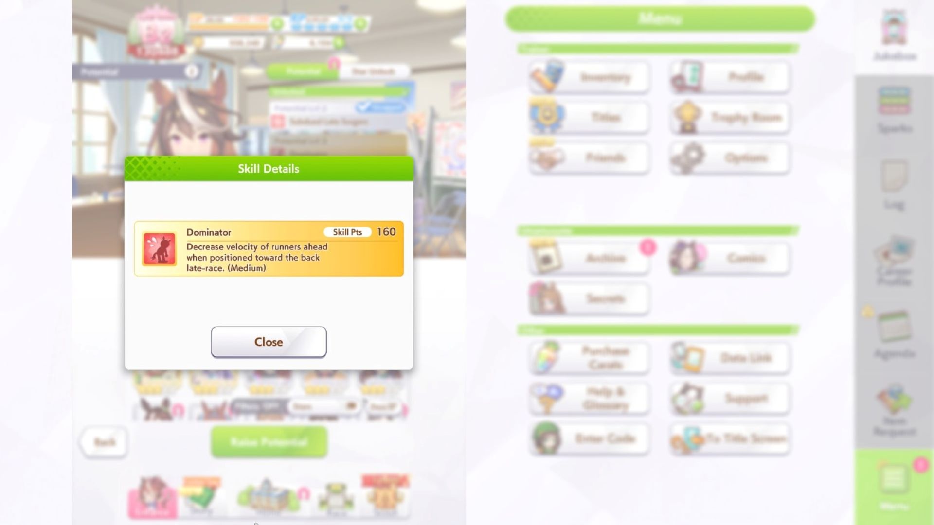 Umamusume Pretty Derby 有許多複雜的遊戲機制。最突出的之一可能是技能。它們按稀缺性分為普通、稀有和獨特,角色包括速度、被動、恢復和減益。稀有減益技能是指高於普通等級的技能組,如果你設法滿足某些條件,可以給你的對手帶來顯著的劣勢並產生巨大的效果。