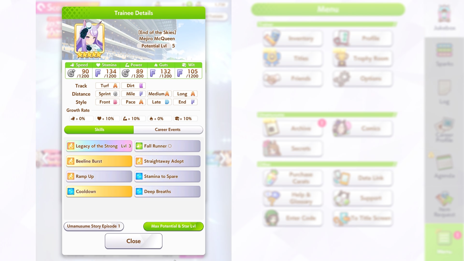 使用帶有領跑者火花的遺產將 Mejiro McQueen 的策略能力從“B”等級提升到“A”。這將使她能夠填補長距離領跑者的空缺,否則該空缺僅由 Mihono Bourbon 和 Mayano Top Gun 佔據。此外,目標是獲得大量的統計火花,讓她在職業生涯中取得領先。