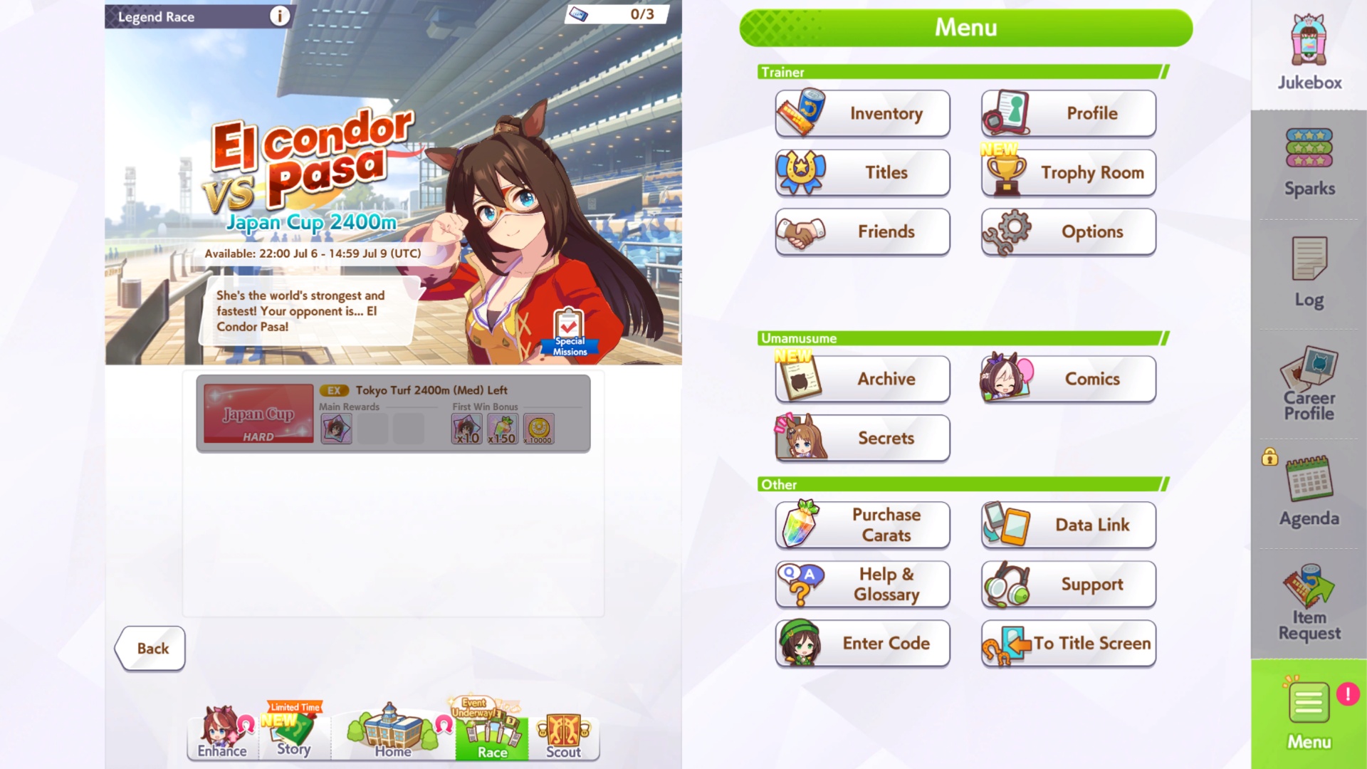 傳奇競賽是競賽選項卡下的一項重複活動,將隨著時間的推移持續進行,但會定期發生變化。在本次比賽中,您將與退伍軍人 Umamusume 一起比賽。你的競爭對手之一將是一位強大的 A 級賽車手。目前,傳奇賽的主要焦點是El Condor Pasa,一位強大的Pacer和Late Surger。擊敗她具有挑戰性,但如果你成功了,你將為她贏得星星碎片。