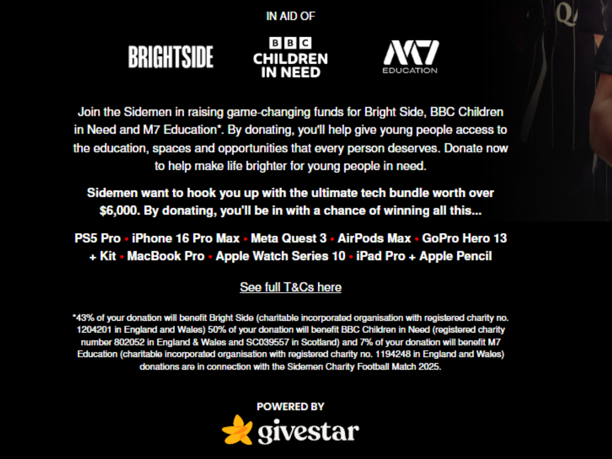 據活動官網介紹,43%的捐款將惠及Bright Side,50%的捐款將捐給BBC Children in Need,剩下的7%將捐給Miniminter旗下的M7 Education。粉絲可以通過以下方式捐款sidemen2025.givestar.io。該組織還將向選定的捐助者贈送禮物。這些禮物包括價值超過 6,000 美元的科技套裝,其中包括 PS5 Pro、iPhone 16 Pro Max、AirPods Max、Apple Watch Series 10、iPad Pro + Apple Pencil 和 AirPods Max。