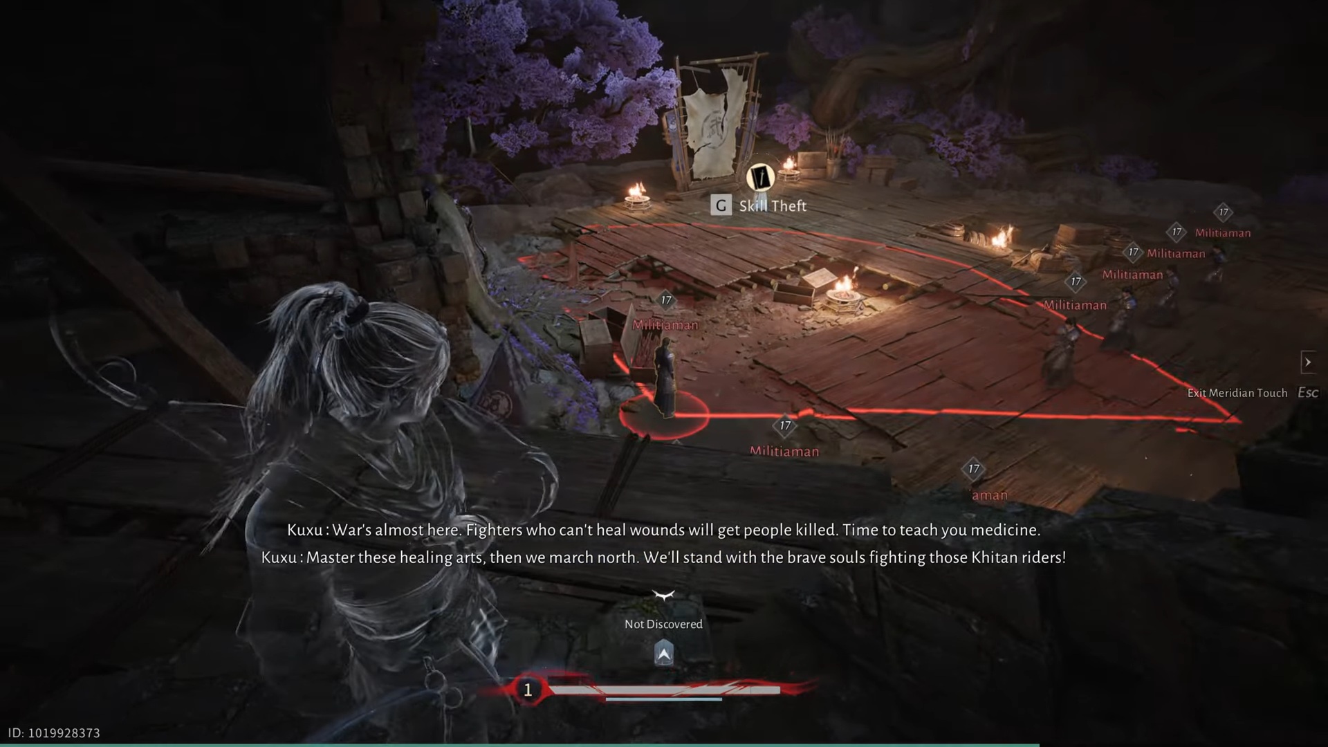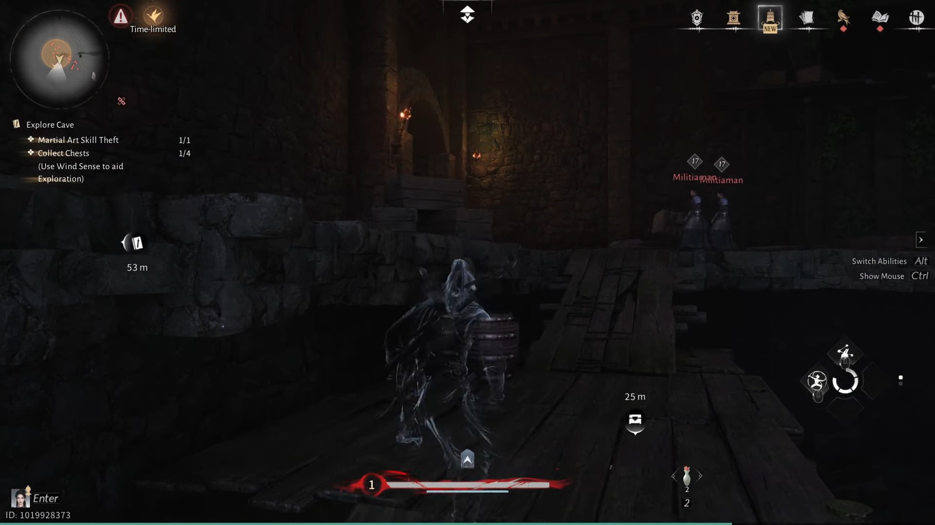 在這裡您會發現另一座有民兵的腳手架橋。下面有兩名民兵巡邏。你必須穿過這個空間並登上對面的梯子。要暫時凍結守衛的踪跡,您可以從後面使用“固定”。你可以沿著走廊向前偷竊一件藝術品,但你的技能盜竊圈就在你的右邊等著你。向右走,發現藍色圓圈,從那裡您可以學習使用令人垂涎的萬能扇。